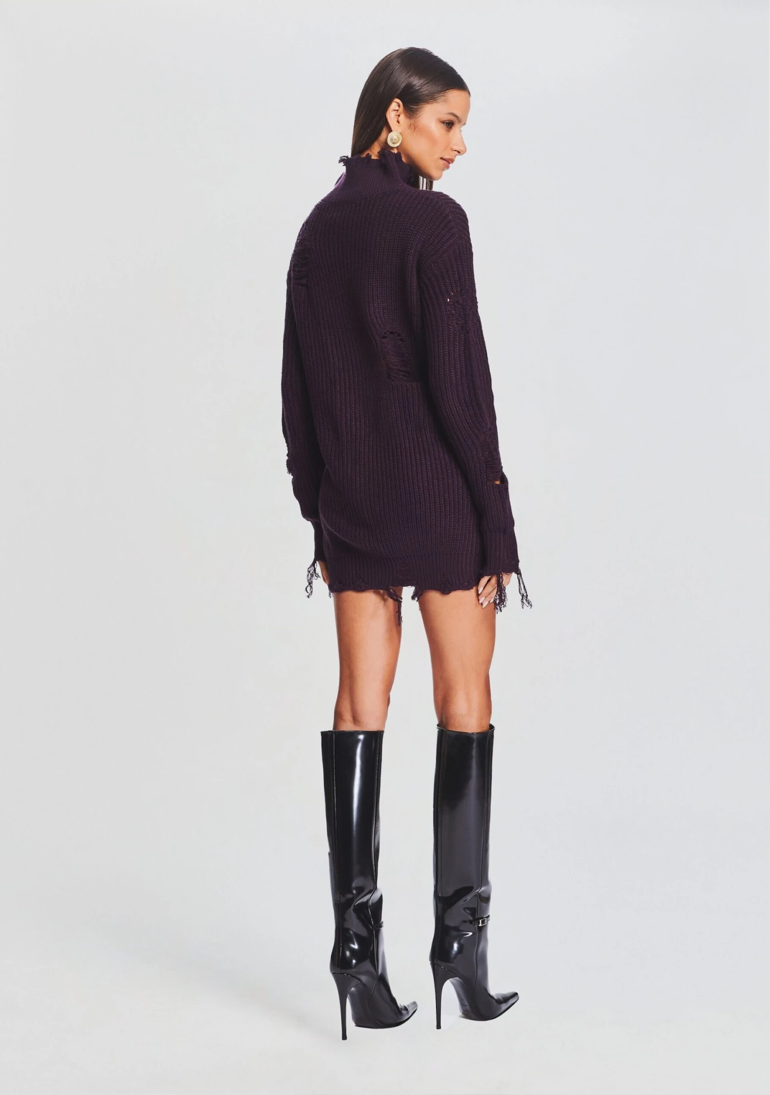 Stay on trend in SER.O.YA’s effortless Capala Sweater Dress. This mini sweater dress boasts a laid-back slouchy, but also put together vibe. It features a cozy turtleneck and a trendy raw hem. This dress is all about comfort and style, perfect for those seeking a relaxed yet fashionable look. Shown here in Eggplant.