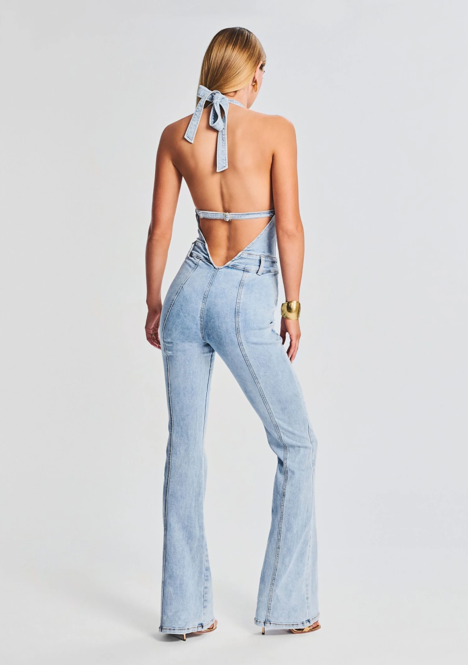 The Cynthia Jumpsuit is a retro-inspired silhouette that is perfectly complemented by just the right hint of stretch, creating a sexy, open back silhouette. Finishing touches include a button front, halter tie neck, and an elongated flare leg. Shown here in Vintage Celeste.