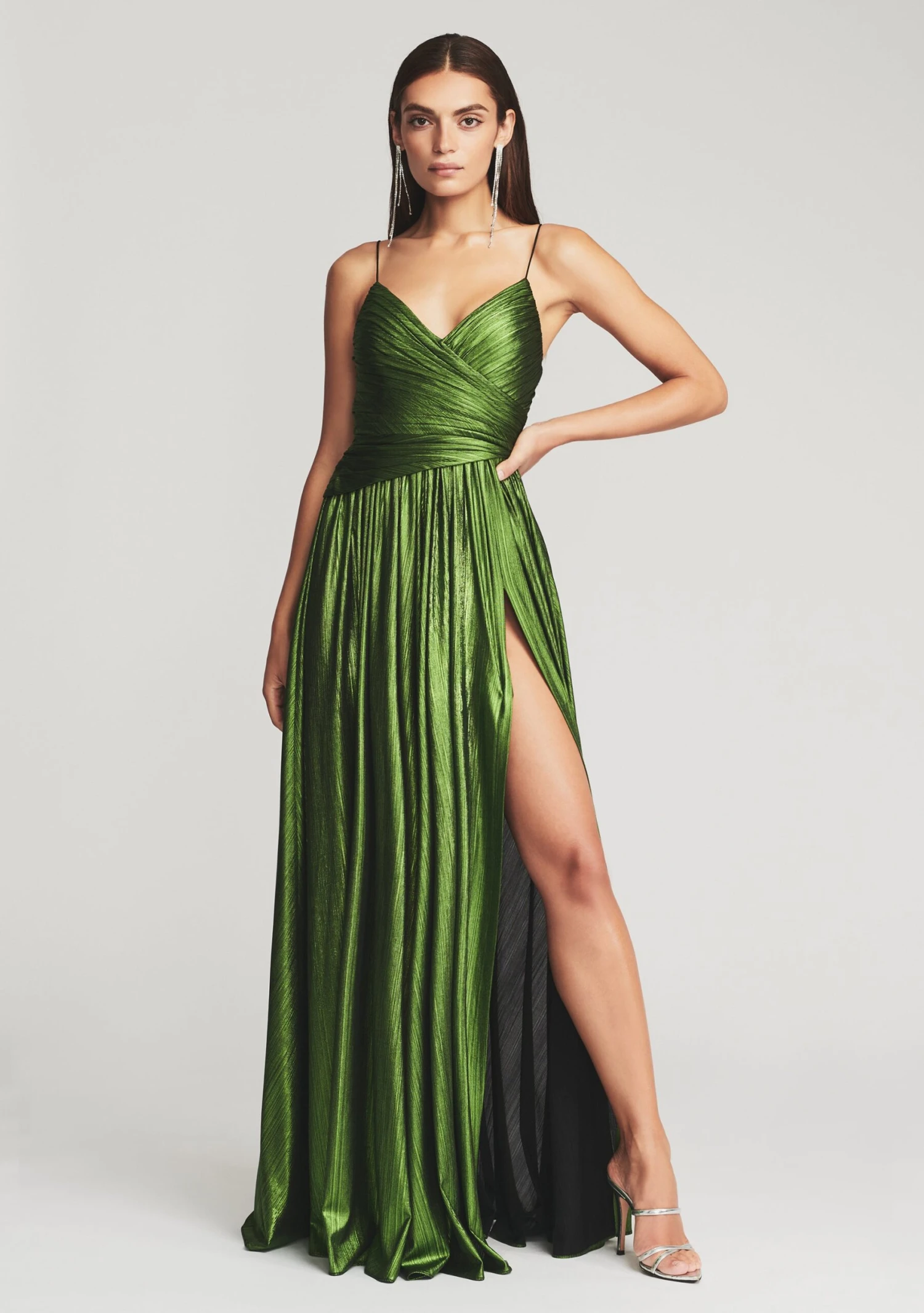 Embrace your inner goddess in our Doss Dress! Crafted in lustrous lamé, this silhouette features ruched panels on the bodice and a floor-length skirt. Barely-there straps and a thigh-high side slit provide the silhouette with a seductively feminine feel. The style is finished with an invisible side zip closure. Shown here in Lime.
