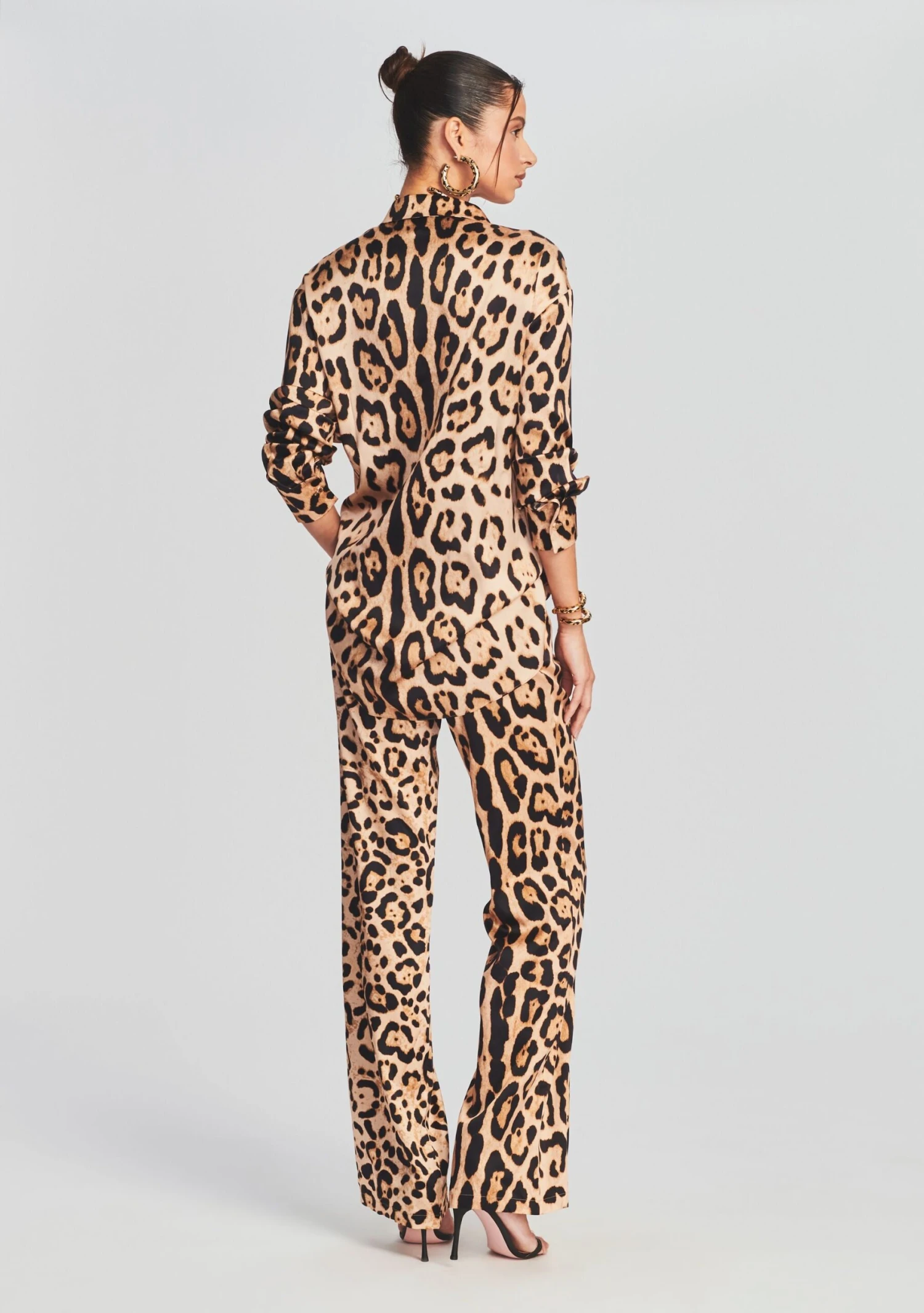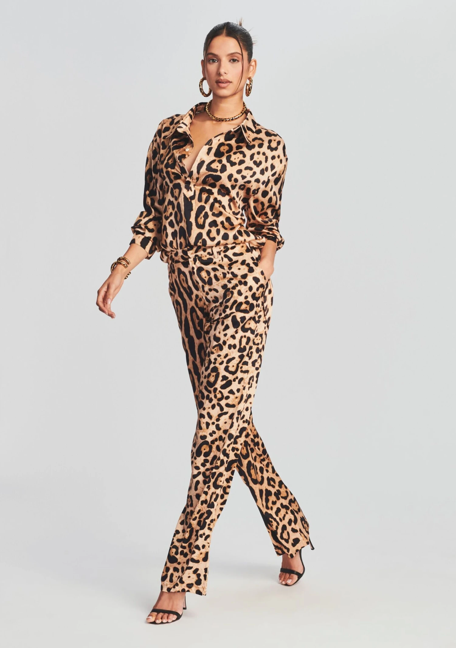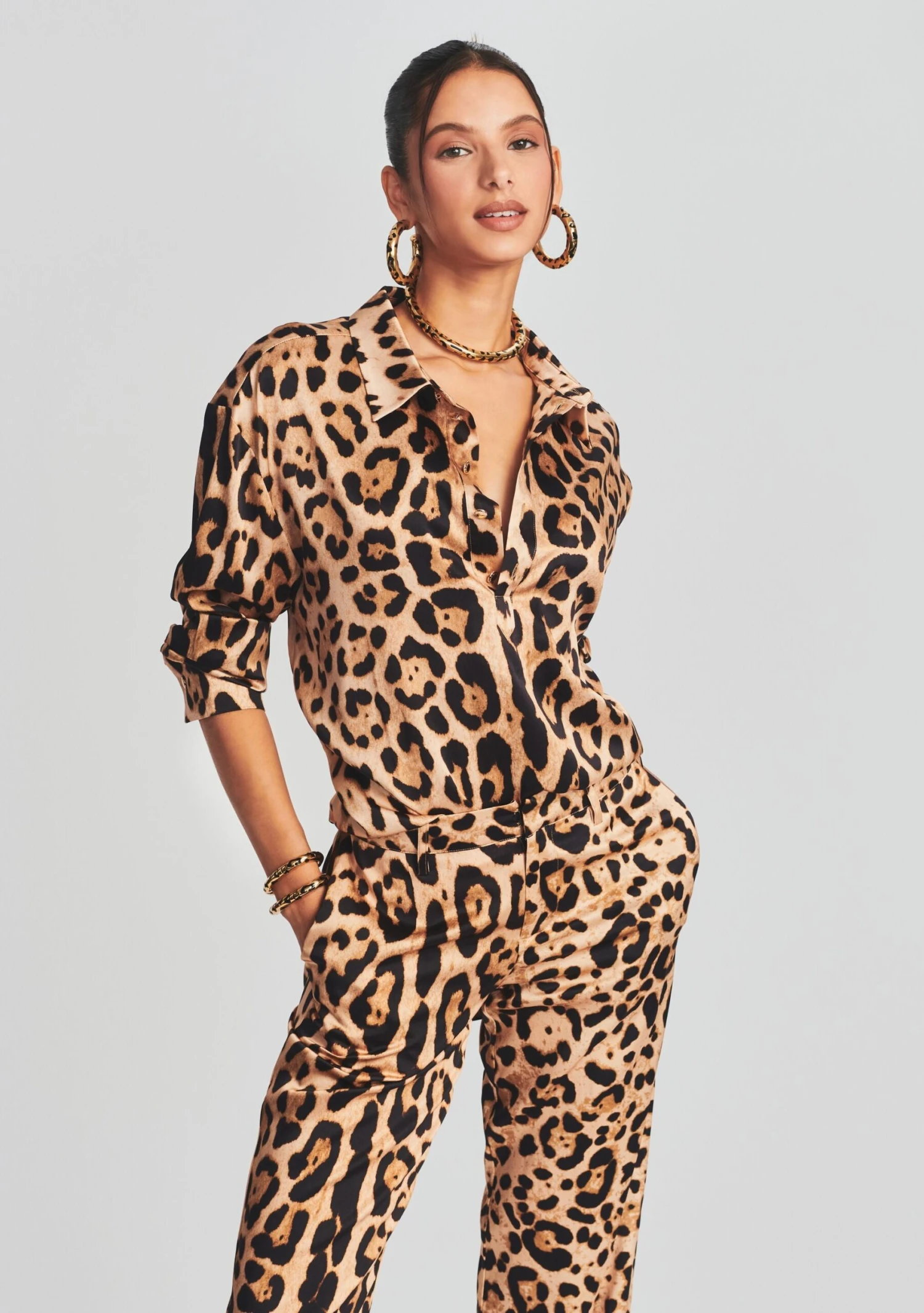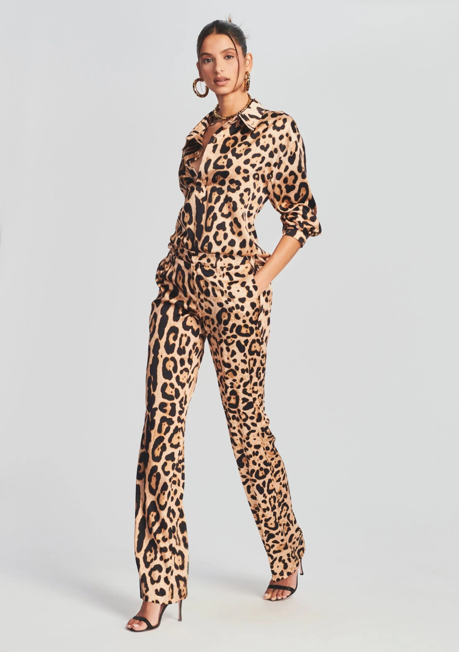 Go bold with the Evan Shirt by SER.O.YA. This classic silk button down shirt in leopard print is complete with standout, exaggerated cuffs. Pair it with the brand’s matching Suki Pant. Shown here in Jaquar.