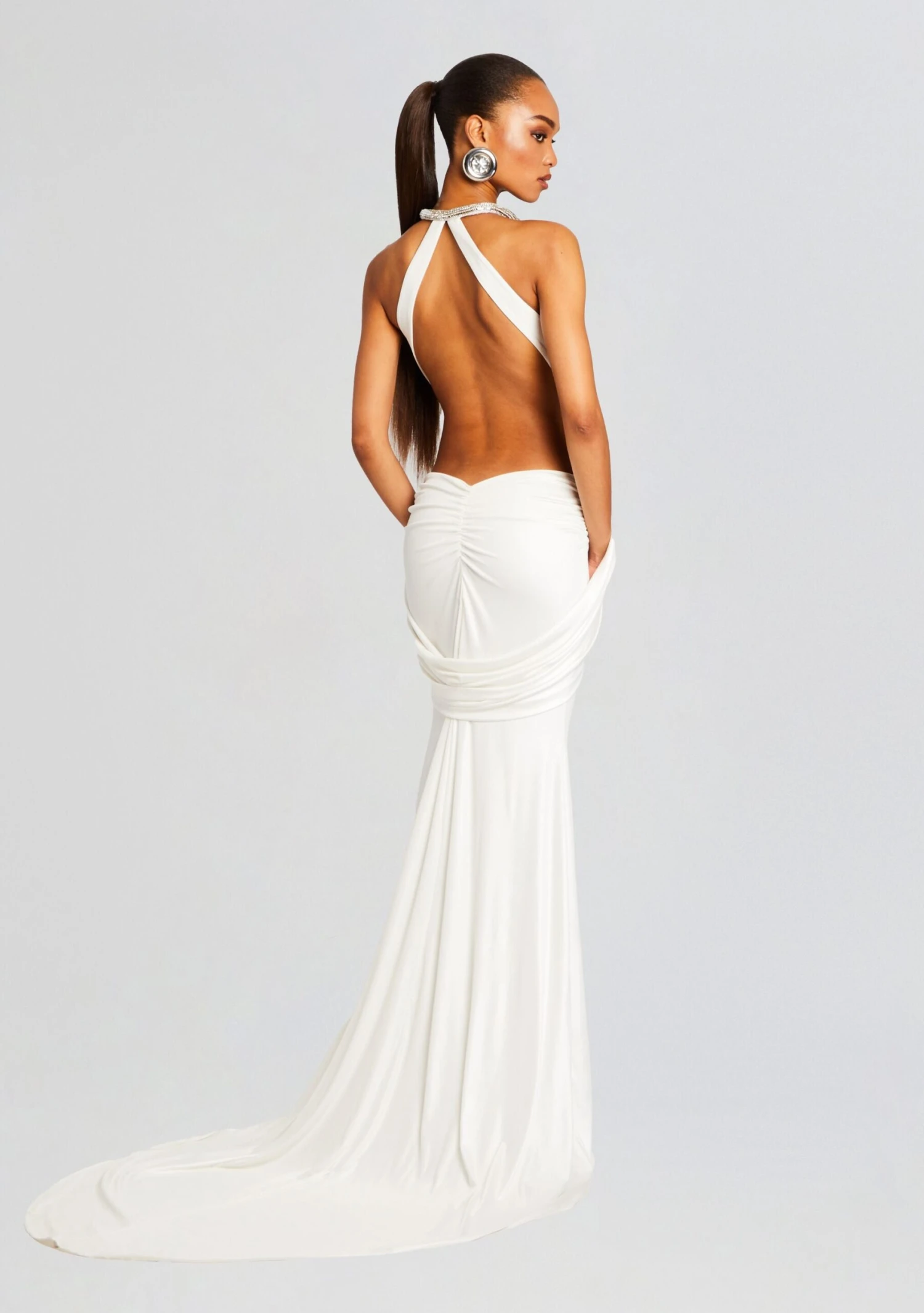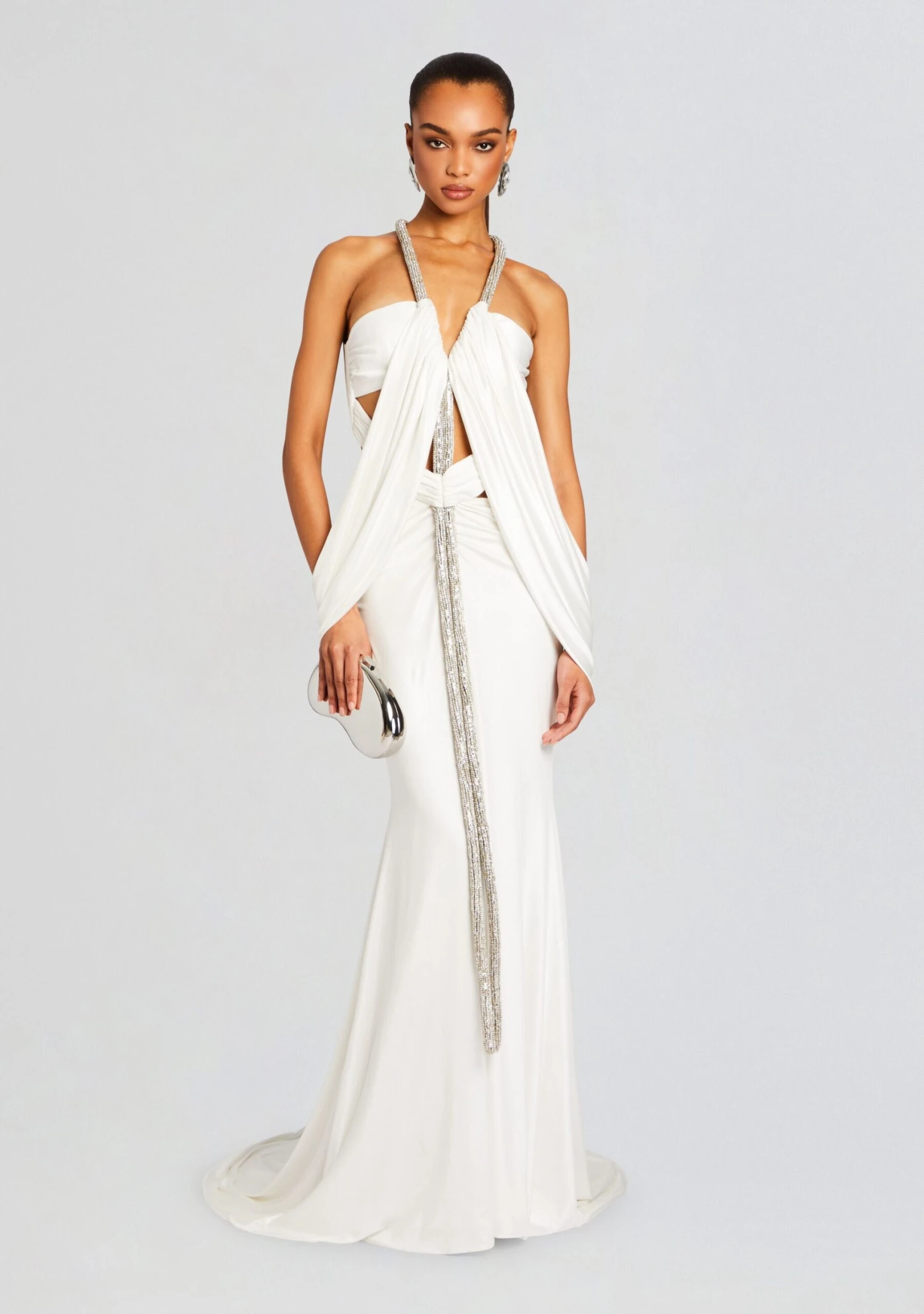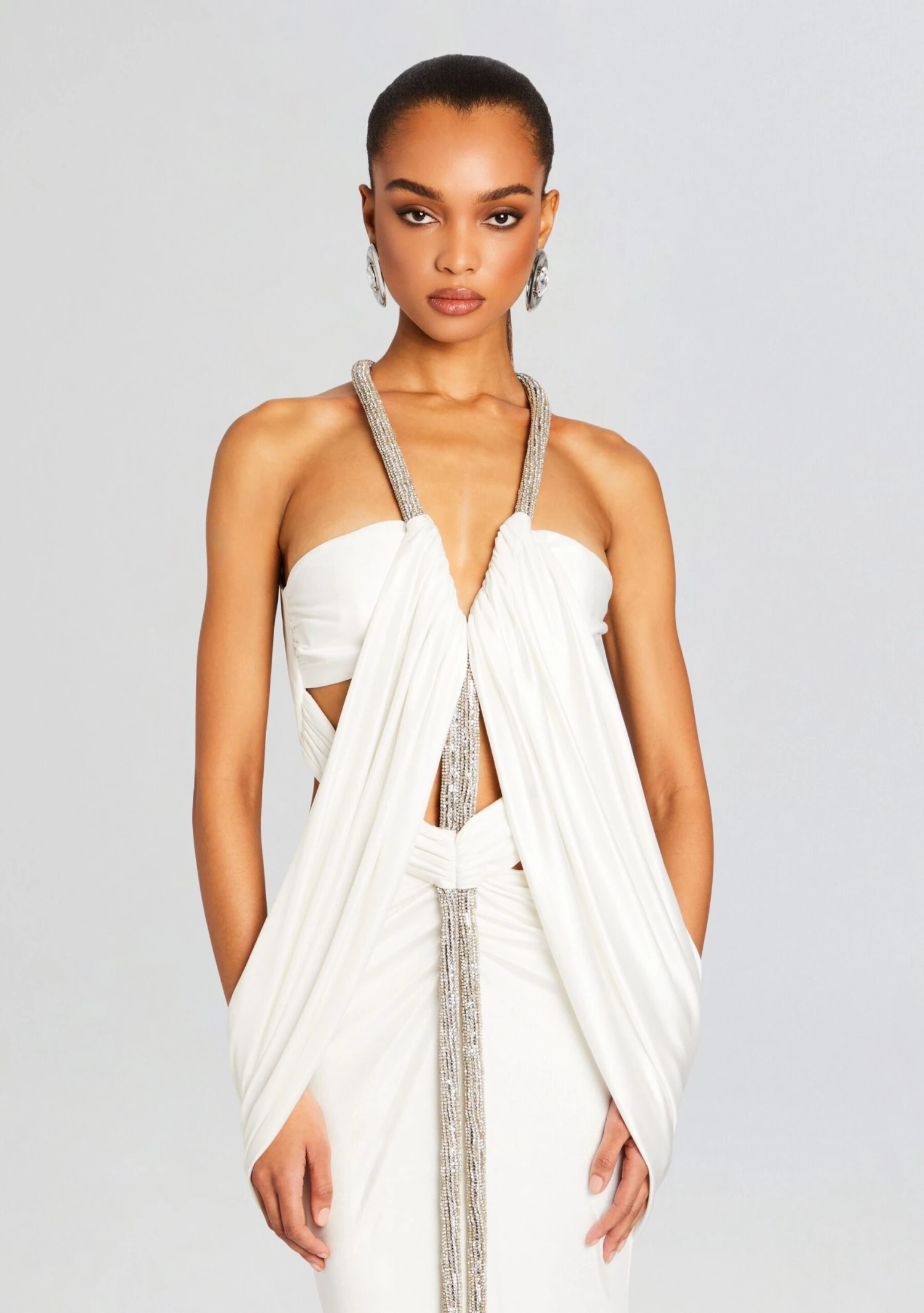 Channel your inner Greek Goddess with out Gaia Dress. This exotic masterpiece combines the allure of a halter neckline, off-shoulder elegance, intricate embellishments, and tantalizing cutouts. This gown will transport you to the era of Greek goddesses, where timeless beauty meets contemporary fashion. Shown here in White/Gold