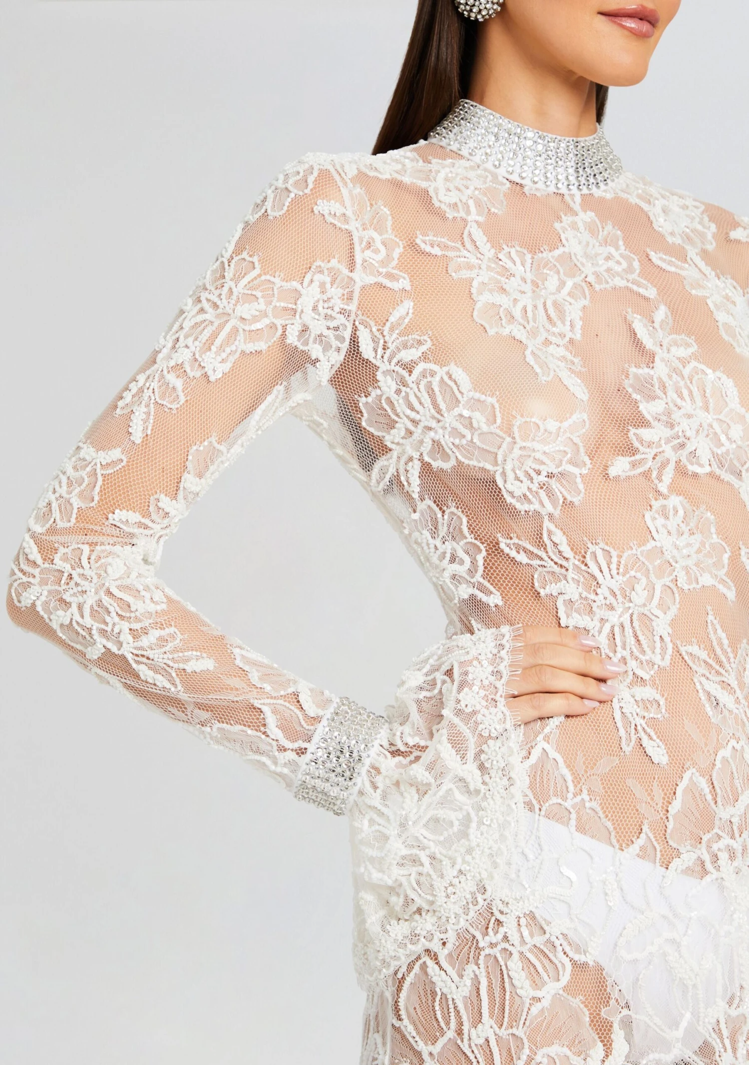 Turn heads with our Rosie Dress—an enchanting blend of modern sophistication and elegance. This dress boasts intricate embellishments adorning the neckline and sleeve cuffs, exuding opulence and charm for any occasion. The sheer fabric offers a touch of allure while allowing the exquisite embellishments to shimmer and captivate. The zip-back closure ensures a seamless and flattering fit, while the scalloped embellished hem adds a whimsical and romantic finish to this ethereal gown. Shown here in White.