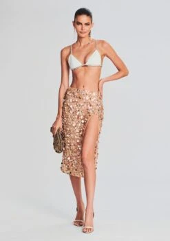 All eyes on your in our Ruby Dress. This sheer lace maxi gown features barely-there straps, a flowing hem and is detailed by a uniquely sequin-embellished pattern. Shown here in White.